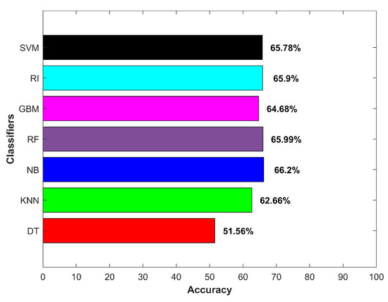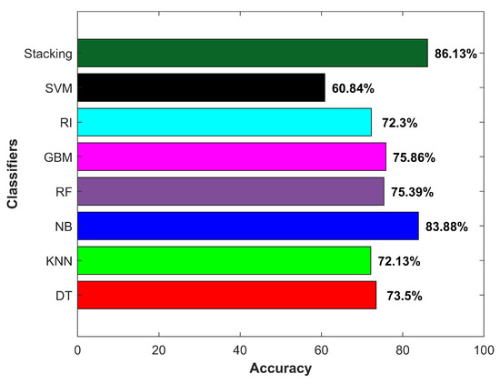 The naive Bayes classifier, which is based on the Bayesian theorem, is a statistical classifier that can predict the probability of a given sample to a particular class. In spite of its simplicity, often, naive Bayes is very effective and can often outperform many sophisticated classification methods [45,46,47]. It calculates the posteriori probability , which is the probability that the hypothesis H holds given the observed data sample X. Let be a training set of samples with n attributes and having class labels ; according to Bayes rule, can be expressed as:
