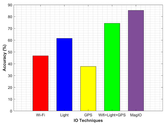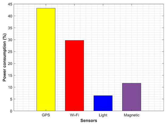 The hybrid IO detection that fused the data from GPS, Wi-Fi and the light sensor could complement other sensors deficiencies and could obtain an accuracy of 70% to 80%. However, the energy consumption is to be dealt with when these sensors are combined. The average energy consumption attitude of these sensors is shown in Figure 25. GPS was the most power-hungry sensor of the smartphone and consumed 43.24% of battery, followed by Wi-Fi, which spent 29.69% of battery. MEMS-based smartphone built-in sensors including a light sensor and the magnetic sensor were less power consuming and used only 6.44% and 11.68% of the battery power, respectively. Similar power consumption results have been reported by other research works [13,75,76].