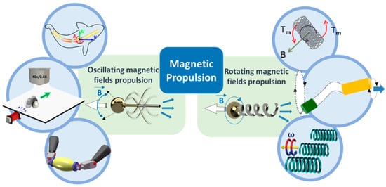 The categories of magnetic propulsion. Adapted with permission from Reference [84], copyright Small 2016; adapted with permission from Reference [85], copyright Advanced Functional Materials 2018; adapted with permission from Reference [83], copyright Nano Letter 2017; adapted with permission from Reference [100], copyright Advanced Materials 2013; adapted with permission from Reference [101], copyright Journal of the American Chemical Society 2010; adapted with permission from Reference [102], copyright Nanoscale 2014.