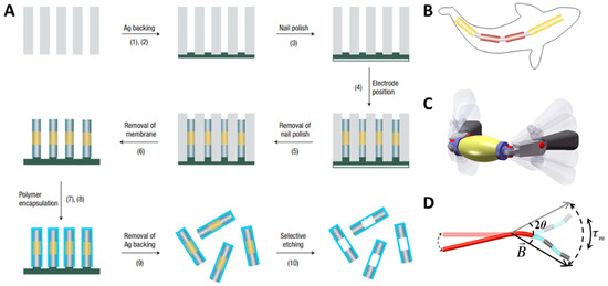 Membrane template-assisted electrodeposition of nanowires. (A) Preparation procedure of flexible metallic nanowires with polyelectrolyte hinges after membrane template electrodeposition. Adapted with permission from Reference [103], copyright Nature Nanotechnology 2007. (B) Schematic illustration of a fish-like nanoswimmer. Adapted with permission from Reference [84], copyright Small 2016. (C) Model of a freestyle magnetic nanoswimmer. Adapted with permission from Reference [83], copyright Nano Letter 2017. (D) Schematic representation of a magnetic multilink nanoswimmer. Adapted with permission from Reference [104], copyright Nano Letter 2015.
