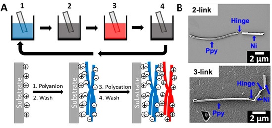 LbL is a manufacturing technique involving the deposition of alternating layers of oppositely charged materials to fabricate a multilayer structure (Figure 3A) [105]. It has the ability to easily and cheaply incorporate distinctive materials, such as small organic molecules, inorganic compounds, macromolecules, and colloids. Researchers have used this technique to fabricate a series of rube and particle micro-/nanorobots. In order to make a soft hinge, Mirkovic et al. [103] encapsulated barcoded metal nanorods with layer-by-layer electrostatically self-assembled polyelectrolyte multilayers. Subsequently, they selectively etched hard metal segments to expose soft polymer hinges. Similarly, in 2015, Jang et al. [104] combined electrodeposition, layer-by-layer deposition, and selective etching to produce multilink nanorobots. They used polypyrrole to make a long tail, and manufactured ferromagnetic nickel rods by iron and nickel. Using this method, they tried out three different multilink nanoswimmers which were termed as 1-link, 2-link, and 3-link, respectively (Figure 3B).