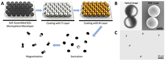 Electron beam evaporation is a type of conventional physical vapor deposition technique which can incorporate desired materials into micro-/nanorobots to perform special functions. It is mostly used to coat nonmagnetic particles with a magnetic material layer. Li et al. [85] applied it to fabricate a Janus microdimer surface walker. This is a type of new micro-/nanorobot which includes two Janus microspheres that are magnetized so as to be propelled by oscillating magnetic fields. Using electron beam evaporation, Li et al. coated half of each microsphere with a desired nickel layer (Figure 4A,B). In 2014, Khalil et al. [107] also used this technique to develop a sperm-shaped microrobot whose head could be affected by controlled oscillating weak magnetic fields. Firstly, MagnetoSperm bodies were fabricated by developing an SU-8 layer printed MagnetoSperm. It was patterned by ultraviolet (UV) exposure in RER600 (ARCH Chemicals, Basel, Switzerland) after the pre-bake. Then, deposited by electron beam evaporation and subsequently lifted-off, a 200-nm-thick cobalt-nickel layer coated the surface of the MagnetoSperm’s head (Figure 4C).