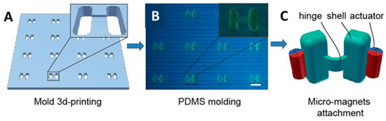 Three-dimensional (3D) direct laser writing (DLW) is a mature technique which is used to fabricate complex structures. Therefore, it is applied by some researchers to manufacture micro-/nanorobots or their molds. The study of Qiu et al. [108] introduced a microrobot which is similar to a scallop, which was readily constructed by 3D printing and the micro-molding technique. First, researchers printed the negative molds of the micro-scallop using a 3D printer (Figure 5A). After that, these molds were filled with a PDMS (polydimethylsiloxane) solution to make the PDMS shells (Figure 5B). The hinge between two shells was fabricated at the same time, which is narrower and thinner then shells. This design is able to decline the elastic force for the microrobot. Finally, released from the molds, the shells were attached to two neodymium micro-magnets (Figure 5C). Using this technique, researchers can fabricate a number of microrobots efficiently.