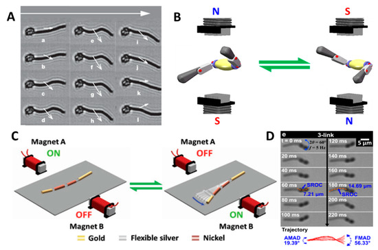 What is more, Jang et al. [104] first fabricated wire multilink nanorobots propelled by two sets of coplanar, opposing coil pairs situated at a 90-degree offset. These two pairs of coils imposed a planar oscillating magnetic field on the nanorobots by generating two sinusoidal oscillating fields. Comparing three types of nanoswimmers with different numbers of links, they observed that these nanoswimmers have different swimming and wagging statuses. It was found that the 3-link swimmers could move faster and more efficiently than the 1- and 2-link swimmers, because an S-like motion was achieved by the tail of the 3-link swimmers (Figure 6D). This feature is achieved thanks to the greater number of links, indicating a higher degree of freedom. Therefore, they argued that the increased freedom can increase the speed of this nanoswimmer, when propelled at the optimum frequency.