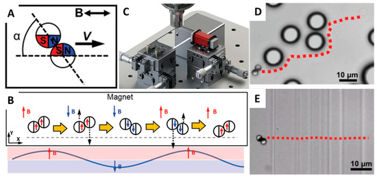 (A) When exposed to a magnetic field, the dimer immediately aligns its major axis with the field direction at an angle α of 47.6 ± 2.6°, determined by the dimer geometry. (B) Schematic showing the propulsion mechanism of microdimer surface walkers under an oscillating magnetic field. (C) Schematic of the experimental setup in which a magnetic dimer moves along the magnetic field direction, away from the magnet. (D) A microdimer surface walker bypasses several polystyrene microspheres. (E) A microdimer surface walker crosses continuous cracks on a glass surface. Adapted with permission from Reference [83], copyright Advanced Functional Materials 2018.