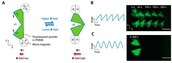 (A) Schematic drawing of a micro-scallop from the top view. The green shapes illustrate the opening and closing shape change of the micro-scallop when actuated by an external magnetic field. (B) Forward net displacement of the micro-scallop in a shear thickening fluid and asymmetric actuation (blue curve). (C) Forward net displacement of the micro-scallop in a shear thickening fluid with symmetric actuation (blue curve). Adapted with permission from Reference [108], copyright Nature Communications 2014.