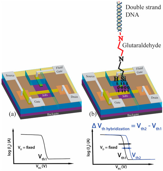 In particular, the SiRi-FETs described in this work can be functionalized using the process shown by Nguyen et al. [5] and Jayakumar et al. [11]. The first step in the DNA probe covalent grafting process is silanization. In this step, the sensor surface is functionalized with single strand DNA using an organosilane such as (3-Aminopropyl)triethoxysilane (APTES) [5]. Later, the sensor can be used for the hybridization detection of target DNA that is complementary to the probe DNA [11]. At the same step, to verify the selectivity of the sensor, its surface is exposed to non-complementary DNA and saline buffer solution that is free of complementary DNA [11]. A well-behaved SiRi sensor is expected to not respond to the non-complementary DNA or the salt crystallization after drying and only exhibit VTH shifts because of the target complementary DNA [11]. Indeed, the sensing mechanism employed by works listed in Table 1 relies on the conductance changes in the SiRi channel. However, as shown in our previous work, during the electrical characterization of the sensor (after silanization, grafting and hybridization steps), the current ratio (ION/IOFF) and subthreshold slope (SS) of the SiRi-FET almost remain constant. The transfer characteristics of the sensor only translate as shift in the threshold voltage [11] (Figure 1). This method of detection ensures that there is no fluctuation of the drain current during sensing and the field effect electrostatic coupling occurs between the charges on the SiRi surface and the channel [11]. The biodetection efficiency of such a DNA hybridization detection process is characterized by the sensitivity parameter, which is defined as the threshold voltage shift (Vth2 − Vth1) after hybridization [11].