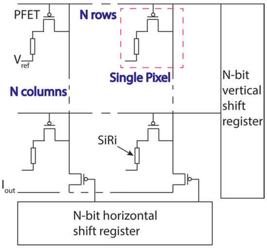 Circuit diagram of SiRi pixel based lab-on-chip (LOC). Each SiRi is connected to an on-chip fluid gate and a control transistor forming a SiRi pixel [14]. “N × N” matrix of such pixels can be addressed using N-bit vertical and horizontal shift register circuits, respectively.
