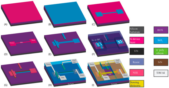 To avail such desirable benefits of CMOS integration, the manufacturing scheme employed for the realization of SiRi pixel sensor also has to be CMOS compatible. Traditionally, there are two methods to manufacture SiRi sensors: (1) bottom-up (BU); and (2) top-down (TD) [15,16,17]. In the BU method, the SiRi sensors are realized by using molecular pre-cursors. For example a silicon nanonet field effect transistor (SiNN-FET) can be manufactured on a bulk Si wafer using the BU method [5,18]. On the contrary, in the TD method, SiRi sensors are commonly realized on a silicon-on-insulator (SOI) substrate using the well-established lithography and patterning techniques [2,3,4,6,7,8,9,19]. It is particularly challenging to transfer the bottom-up grown nanonets on to a CMOS wafer and continue processing due to the tangling of the grown wires, difficulty in alignment and manual errors [20]. Further, in the bottom-up method, the probability of introducing contaminants on to the wafer is very high [18,20]. It also demands the usage of specialized alignment methods that tend to be time consuming [18,20]. In comparison, the top down method is CMOS compatible and allows for the low-cost co-integration of SiRi sensors with metal-oxide-semiconductor field-effect transistors (MOSFETs) and circuits [14,15,16,17].