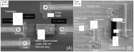 Top view scanning electron microscope (SEM) image of a single SiRi pixel showing the control FET, fluid gate and SiRi sensor: (A) before opening access to the SiRi test site; and (B) after opening access to the SiRi test site.