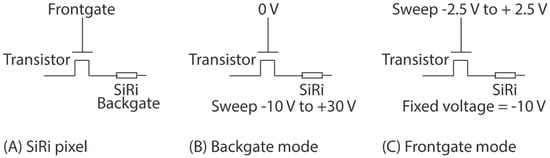 The setup shown in Figure 3I was used for the electrical evaluation of the SiRi pixel sensors prior to functionalization. A Cascade 12,000 semi-automatic wafer prober (Cascade Microtech, Beaverton, OR, USA) that was externally connected to a Keithley 4200-SCS parameter analyzer (Tektronix, Inc., Beaverton, OR, USA) was used to perform direct current (DC) electrical measurements. It also facilitated full-scale wafer mapping. In the pixel module, the source terminal of the transistor is connected to the column selection line while the drain terminal of the transistor is connected to the SiRi. The SiRi pixel can be operated in two modes—the backgate mode (Figure 5B) and frontgate mode (Figure 5C). In the backgate mode, the gate of the control transistor is biased at a fixed frontgate voltage while the SiRi is turned ON or OFF by sweeping the backgate voltage (Figure 5B). In the backgate mode, to turn ON the SiRi pixel, sufficient frontgate voltage needs to be applied such that the MOSFET is first turned ON (Figure 5B). In the frontgate mode, the MOSFET is turned ON or OFF by sweeping the gate of the control transistor while the SiRi is biased at a fixed backgate voltage (Figure 5C). In the frontgate mode, to turn ON the SiRi pixel, sufficient backgate voltage needs to be applied such that the SiRi is first turned ON. In the frontgate mode, the SiRi behaves as a resistor but turned ON/OFF using the backgate voltage (Figure 5C).