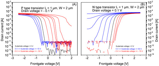 Figure 6 shows the wafer scale ID-VG transfer characteristics (at VBG = 0 V) of standalone NMOS and PMOS transistors manufactured using the same fabrication process as the SiRi pixels. The NMOS and PMOS transistors have a SS of 60–65 mV/dec. The extracted VTH for NMOS is in the range from −0.3 to 0.3 V while the PMOS transistor has VTH in the range of −0.9 to −1.1 V. Figure 7A,B shows the ID-VG transfer characteristics of a single PMOS and NMOS device manufactured on SOI wafer at different VBG.