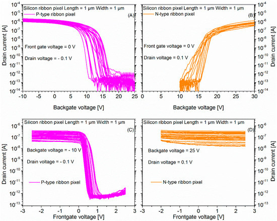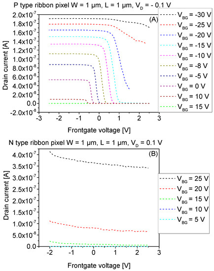 Figure 8A,B shows the wafer scale backgate mode ID-VBG transfer characteristics of P- and N-type SiRi pixels (L = 1 μm and W = 1 μm), respectively, with frontgate voltage of the control transistor fixed at 0 V.