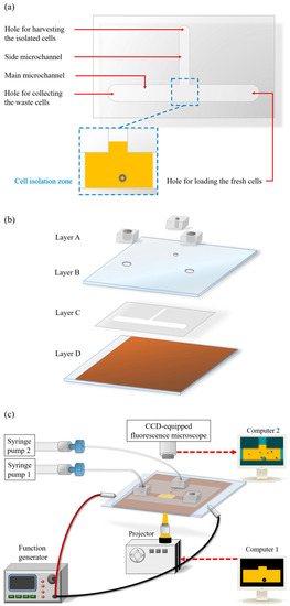 In the subsequent assembly process, the three through-hole component (Layer A) was bonded with Layer B via O2 plasma surface treatment. This step was followed by assembling with Layer D with the fabricated double-sided adhesive tape (Layer C) (Figure 1b). In operations, the loaded cell suspension sample was transported in the main microchannel using a suction-type syringe pump (Syringe pump 1; Figure 1c). To achieve the ODEP force-based cell manipulation [30], a function generator was used to apply an alternating current (AC) voltage between the two ITO glass layers (Layers B and D; Figure 1b) of the proposed system. A commercial digital projector (PLC-XU350, SANYO, Osaka, Japan) coupled to a computer (Computer 1; Figure 1c) was used to display light images onto the photoconductive material (Layer D) to generate an ODEP force on the manipulated cells. In addition, a CCD-equipped fluorescence microscope (Zoom 160, Optem, Fairport, NY, USA) was utilized to observe the manipulation of cells in the proposed system. The overall experimental setup is schematically illustrated in Figure 1c (a photograph of the experimental setup is provided as a Supplementary Figure: Figure S1).