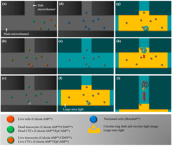 Schematic illustration of the overall working procedures for the isolation of EpCAMneg and CD45neg cells: (a) Fluorescence microscopic observation was performed at the defined cell isolation zone to detect the live EpCAMneg and CD45neg cells (i.e., the orange colour-only dot images) in a dynamic cell suspension flow; (b) the cell suspension flow was temporarily suspended when a live EpCAMneg and CD45neg cell (pointed out by the arrow marker) was observed in the cell isolation zone; (c) the optical filters in the fluorescence microscope were then switched to observe the green colour-only dot images (i.e., the leucocytes or EpCAMpos CTCs); and (d) then the blue colour-only dot images (i.e., the all nucleated cells); (e) after the contradistinction, the desired cell (i.e., the live EpCAMneg, CD45neg and Hoechstpos cells) in the cell suspension was then targeted under light field microscopy (pointed out by the arrow marker); and (f) a large-area light was used to illuminate the cell isolation zone to anchor the cells within the light-projected region. Additionally, a circular ring dark image was utilized to first enclose the targeted cell and was (g) soon followed by expansion of the width of the ring belt. (h,i) The circular ring dark image around and the circular light image on the targeted cell were then moved to deliver the enclosed cell to the side microchannel for the subsequent collection.
