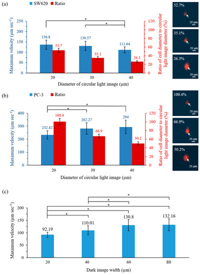 Quantitative relationship between the diameter of the circular light image (and the diameter ratio of the cell to the circular light image) that is used and the maximum velocity (μm s−1) of the moving circular light image that can manipulate (i.e., attract and drag) (a) SW620 and (b) PC-3 cancer cells (right column: the microscopic images of various diameter ratios of cell to circular light image; the cells are pointed out by arrow markers) and (c) the quantitative link between the dark image width that is used and the maximum velocity (μm s−1) of the moving dark image that can manipulate (i.e., repulse and push) leucocytes.
