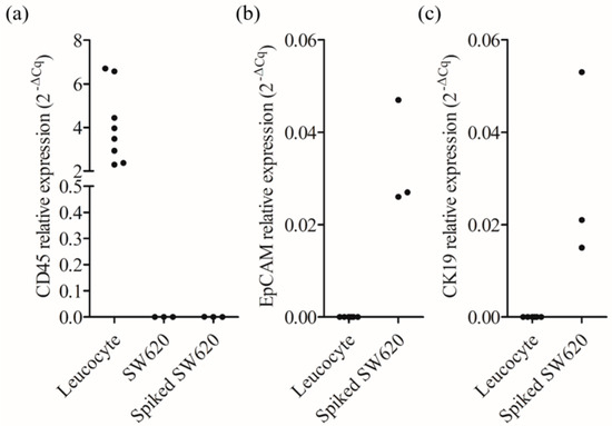 Analysis of the gene ((a) leucocyte-specific CD45 and cancer cell-specific (b) EpCAM and (c) CK19 genes) expression levels in the pure leucocytes, the SW620 cancer cells, and the cells isolated by the proposed method.