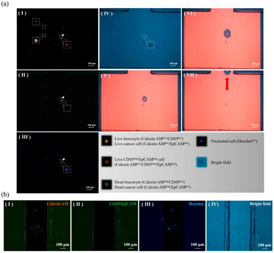 In addition to the cancer cell line model described above, the performance of CD45neg/EpCAMneg cell isolation was also evaluated using a clinical sample model. In this work, blood samples were obtained from patients diagnosed with head-and-neck cancer. The samples were first treated, and the CD45neg/EpCAMneg cell isolation process was then performed as described in Figure 2. Figure 5 shows the real cell isolation operation process. Briefly, Figure 5a(I–III) demonstrated the process of fluorescence microscopic observation to identify the CD45neg/EpCAMneg cells marked by the arrow; these cells were found in both the orange colour-only dot image (Figure 5a(I–II)) and the blue colour dot image (Figure 5a(III)). After the CD45neg/EpCAMneg cell was positioned using light field microscopy imaging (Figure 5a(IV)), ODEP-based cell manipulation was carried out to isolate the cells targeted to the side microchannel (Figure 5a(V–VII)). Through repetition of the processes abovementioned, the CD45neg/EpCAMneg cells were able to be isolated and temperately stored in the side microchannel for the subsequent collection. In this work, the purity of the live CD45neg/EpCAMneg cells in the side microchannel was further evaluated microscopically. The results (Figure 5b) revealed that the purity of the live CD45neg/EpCAMneg cells was as high as 100%, which is beyond the currently possible purity obtained by using other existing cell isolation techniques. In this proof-of-concept study, the proposed ODEP-based cell isolation system has not yet been automated. The operating time for processing 4 mL of blood sample was about 4 h, in which the manual fluorescent microscopic observation consumed most of the time required. As a result, the automation of the proposed system will be our future goal, which can largely improve the working throughput of the proposed ODEP-based cell isolation system.