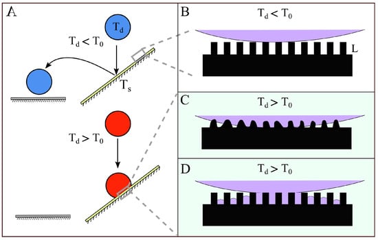 There is evidence that surface tension is not the only mechanism by which a sufficiently hot drop could initiate a Cassie–Baxter to Wenzel state transition. Liu et al. [10] found that drops would stick to lotus leaves when the drop temperature exceeded C and speculated that the waxy microtexture could be melting at these temperatures [10] (Figure 1C). Alternatively, if the surface is below the dew point, water vapor from the air can condense within the microtexture and drive the drop into a Wenzel state [11,12]. Even if the surface is above the dewpoint of the ambient air, the slight evaporation of the water drop residing on the microtexture can locally saturate the air, which can then condense on a slightly cooler microtexture (Figure 1D). In fact, experiments of static drops resting on superhydrophobic surfaces have shown that, when the surface temperature is lower than the drop temperature, then this evaporation–condensation process can transition the drop into a Wenzel state [13].