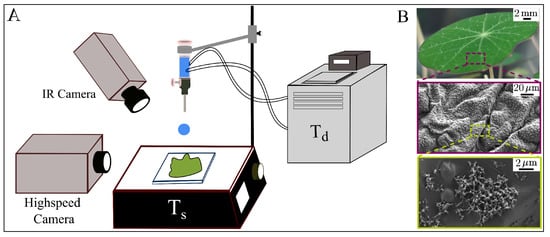 (A) a schematic of the experimental set. Cameras film a water drop at temperature as it falls from a suspended needle and impacts a Nasturtium leaf heated to temperature ; (B) images of a Nasturtium leaf taken at different magnifications illustrate the hierarchical microstructure.