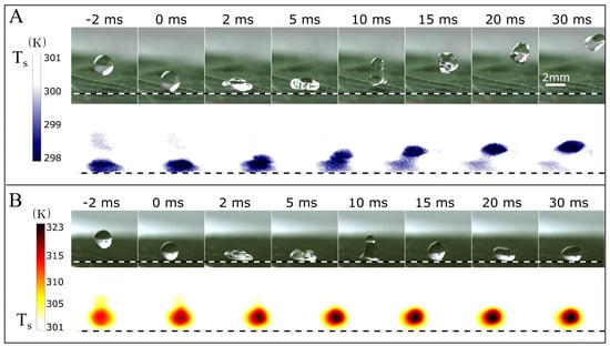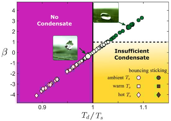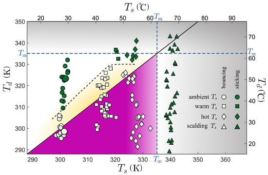 Drawing from past studies, we focus on two alternative mechanisms: melting of surface microtexture and evaporation–condensation within the superhydrophobic texture. The results in Figure 5 might appear inconsistent with both mechanisms. Specifically, if a drop at were able to melt the microtexture, then it would seem improbable that drops of any temperature would bounce if the surface were above this temperature , yet the results illustrate that they do (thus we estimate ). Similarly, the existence of the yellow region in Figure 5 is in contrast with previous works for static drops, which predicts sticking for a drop whenever its temperature is larger than that of the surface [13]. However, if the dynamics are considered, it might be possible that, depending on the conditions, there could be regimes in which these effects are present but insufficient to inhibit bouncing.