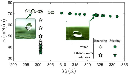 To assess whether this critical temperature can be explained solely as a consequence of a critical surface tension, we compare the threshold surface tension for varying drop temperatures with the threshold surface tension for varying drop compositions (Figure 4). Specifically, we repeat the drop impact experiments at ambient conditions using drops that contain varying concentrations of ethanol and water. Due to the low surface tension of pure ethanol (), adding a small amount of ethanol to water can dramatically lower the surface tension. Given that these experiments were carried out at room temperature, we approximate the drop temperatures as remaining constant at (Figure 4), and estimate the surface tension based on the concentration of ethanol in the drop following the empirical analysis by Khattab et al. [23]. At low ethanol concentrations, the drop bounces off of the Nasturtium leaf (Figure 4, open stars), whereas, at sufficiently high ethanol concentrations, the drop will stick on the surface (Figure 4, filled stars). The surface tension that corresponds to this transition is , a value that is far less than the surface tension of the water, even at the hottest temperatures. Therefore, it appears that the critical temperature for a water drop cannot be explained solely as a consequence of a critical surface tension, and instead relies on a mechanism in which the temperature modifies the surface during contact.