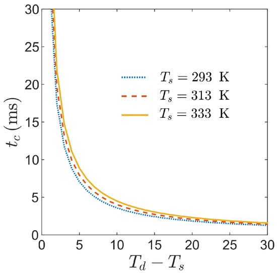 Figure 6 shows plots of the condensation time, predicted from Equation (2), as a function of the temperature difference between the water drop and surface. Here, the characteristic microtexture length is , and the different curves represent three different surface temperatures. The results show that this condensation filling timescale is significantly larger than the evaporation timescale , and therefore it is reasonable to assume that the drop evaporation keeps the microtexture air fully saturated as the condensate forms. Additionally, the results illustrate the importance of the temperature difference , rather than the temperatures themselves, in determining the condensation filling timescale .