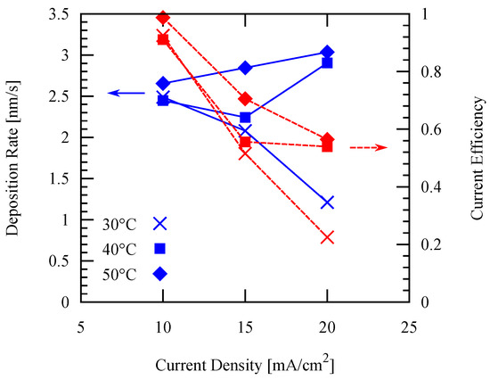 Deposition rate and current efficiency using different current densities at different electrolyte temperatures with 60 s/10 s forward/reverse current duration.