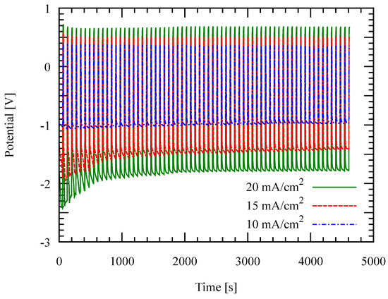 Deposition potential as a function of time during the deposition at 30 C with different current densities. Negative potential shows the deposition potential.