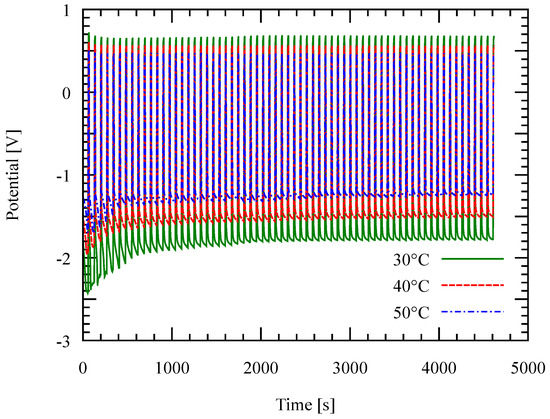 Deposition potential as a function of time during the deposition at different temperatures with a fixed current density of 20 mA/cm. Negative potential shows the deposition potential.