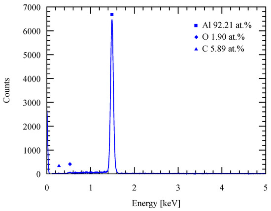 To evaluate the purity of the deposit, an energy-dispersive X-ray spectroscopy (EDS) was performed on the deposits as shown in Figure 9. According to the EDS result, an Al deposit with high-purity is obtained from the electroplating process. Oxygen naturally exists due to the high reactivity of Al with oxygen, which forms native oxide on the surface as soon as it is exposed to the atmospheric environment. No trace of Cl shows that there is no ionic liquid residue that remains on the deposit, while C atoms can be attributed to the measurement environmental effects, i.e., the SEM stage.