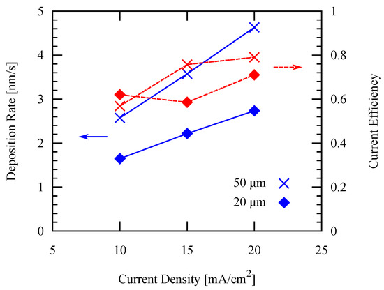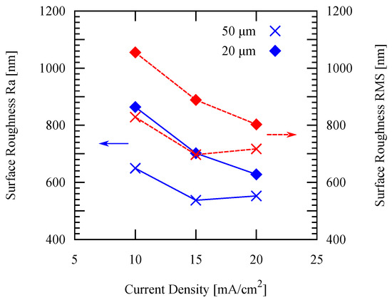 For the patterned electroplating experiments, the temperature is fixed at 50 C, while two different pattern widths are applied: 50 µm and 20 µm. It is shown in Figure 10 that both the deposition rate and the current efficiency increase by increasing the current density. Furthermore, both the arithmetic average surface roughness and root mean squared (RMS) roughness measured by white light interferometry decreases as the current density increases as shown in Figure 11. These values are in agreement with those values of previous studies mentioned in the previous section, which showed similar trends.
