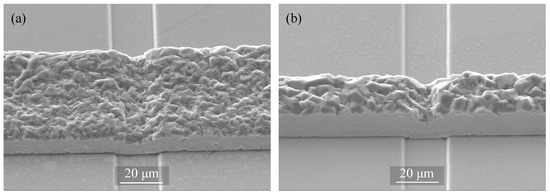 SEM images of the pattern-deposited films on a 2 µm–depth trenched substrate with (a) 50 µm and (b) 20 µm frame width obtained at 20 mA/cm.