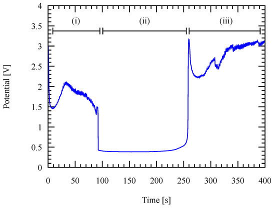 Region (i) in Figure 14 corresponds to the removal process of the native oxide at the surface of the Al seed layer. Region (ii) corresponds to the pure Al surface exposure to the electrolyte and region (iii) corresponds to the depleted Al seed layer, leaving the Si substrate exposed to the electrolytes. In this experiment, all processes are done with a reverse current to completely remove the native oxide layer as in region (i) with an additional 30 s in region (ii) to have a more certainty.