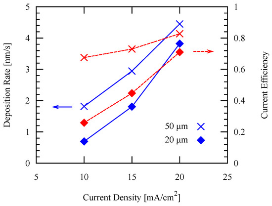 Deposition rate and current efficiency using different current densities applied with different pattern widths.