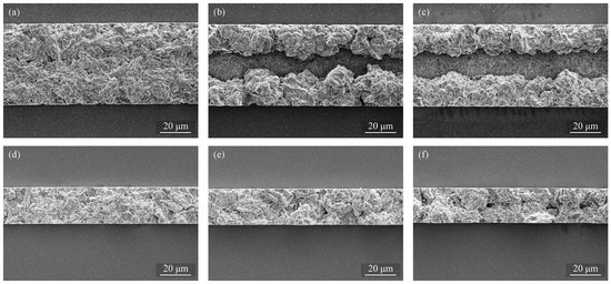 SEM images of the pattern-deposited films with 50 µm frame width obtained at (a) 10; (b) 15; (c) 20 mA/cm and with 20 µm frame width obtained at (d) 10; (e) 15; and (f) 20 mA/cm.