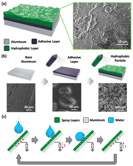 Energy harvesting is a method of converting energy from ambient environment into useful electrical energy. Harvesting energy from the ambient environment is gaining more and more interest due to the increasing number of sensors inside personal electronic devices, which consume extra power and drain batteries much faster. In this respect, there is an increasing number of studies on the use of solar [1], thermal [2] and RF [3] energy to power various sensors and electrical components. Among these energy sources, mechanical energy is one of the desirable sources that is not affected by external environment such as weather, location and so forth. To produce electricity from a mechanical input, piezoelectric [4,5], capacitive [6] and electromagnetic transduction [7] generators have been developed. Recently, the triboelectric nanogenerator (TENG) was introduced as a solution that can effectively generate electricity from mechanical motions by contact electrification [8,9,10,11,12]. In particular, liquid-solid contact TENGs, which use the liquid itself as a triboelectric material, are in the spotlight because they can overcome the inevitable friction wear between two solid materials in conventional TENGs [13,14,15]. For liquid-solid contact TENGs to produce a sustainable energy output, the solid surface must be superhydrophobic to repel the liquid after it falls. However, producing a superhydrophobic coating on metal or polymer surfaces requires complex fabrication procedures such as vapor deposition [16], plasma treatment [17], or self-assembled monolayer coating [18] to create micro-/nanostructures and to lower the surface energy. In addition, these methods have limited applications for complex 3D surfaces. Therefore, for liquid-solid contact TENGs to be commercialized, the fabrication procedures need to be simple and appropriate for mass production.