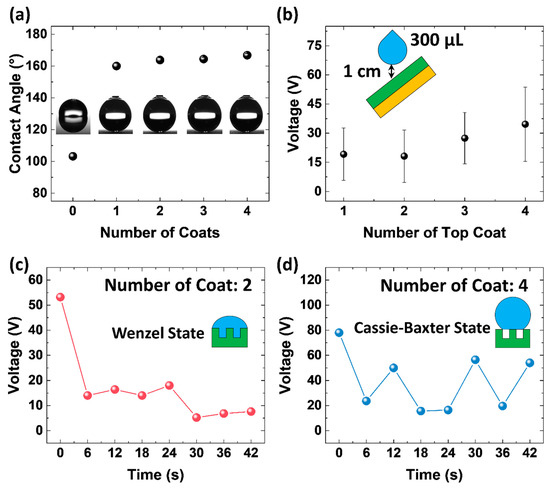 (a) Contact angle and (b) VOC output depending on the number of top coats applied. Peak VOC value of sprayed-on triboelectric nanogenerator (TENG) with (c) 2 top coats and (d) 4 top coats.