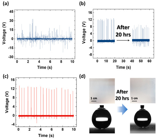 (a) VOC output of sprayed-on TENG with water applied using a commercial shower head; (b) VOC output of sprayed-on TENG after 20 h of water application; (c) Recovered VOC output of sprayed-on TENG after drying; (d) Surface and contact angle of sprayed-on TENG before and after 20 h of water application.
