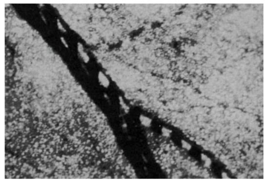 Red blood cell manipulation by ultrasound in a chick embryo. The image shows a chick embryo vasculosa where red blood cells are trapped in clusters separated by half the wavelength at 3 MHz continuous ultrasonic irradiation. The image was acquired through a microscope with 26× magnification. Reprinted with permission from [10].