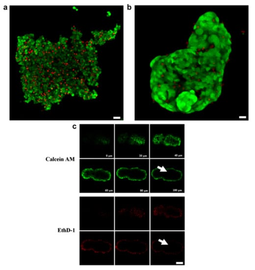 The step from forming monolayers by USW trapping to culturing 3D cell aggregates is not big. In the device where most of the above-mentioned studies were performed, the third dimension is added to the already established 2D monolayers by increasing the cell concentration until multiple layers are trapped in contact with each other [15]. To demonstrate this, aggregates of trapped HepG2 hepatocellular carcinoma cell line cells were stable enough to be handled after 5 min of USW trapping and could be transferred and encapsulated in alginate. The encapsulated aggregates showed retained cell viability over 10 days of culture compared to non-encapsulated 3D HepG2 aggregates (Figure 2). Confocal microscopy images of aggregates stained with calcein AM and EthD-1 revealed poor dye penetration into the 3D aggregates, which indicates mature cell–cell contacts and thus limited molecule diffusion (Figure 2c). Additionally, F-actin staining showed similar actin organization to that in the monolayer case described above but with the added third dimension to the cell aggregates [21].