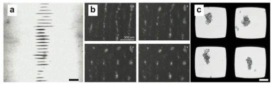 A facile approach to creating multiple pressure nodes to parallelize cell aggregate formation is to use a similar layered resonator device described above, but tune the frequency or resonator dimensions to fit multiple wavelengths in the fluid layer. This effectively initiates multiple pressure nodes for cells to be trapped in and has been implemented by Liu et al, where multiple disk-shaped HepG2 hepatocellular carcinoma cell aggregates (Figure 3a) were formed along the axis of the wave propagation [29]. These HepG2 cell aggregates were formed during 30 min of continuous USW trapping before being transferred to a low-attachment substrate for further culture.