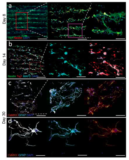 Patterned and in situ differentiated neurons can model the cerebral cortex. USW-based arrangement of neural progenitor cells during fibrin hydrogel cross-linking formed stable cell layers embedded in the hydrogel suitable for long-term culture without USW. This allowed for differentiation of the neural progenitor cells into neurons in situ which interacted between layers after 8 days (a). Fourteen days after culture, mature neuron maker MAP2 was co-expressed together with Tuj1 (b). The excitatory marker CaMKII and glial cell marker GFAP are detected after 30 days of culture (c,d). All scale bars indicate 30 µm. Reprinted with permission from [53].