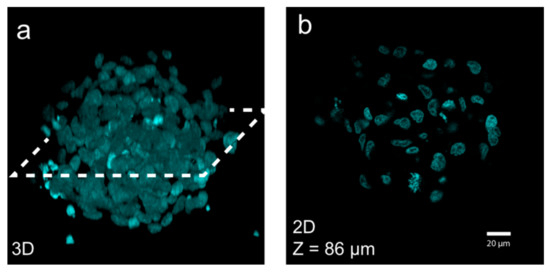 On-chip confocal imaging illustrates the strength with USW-based multi-cellular tumor spheroid (MCTS) culture platforms. Nuclear dye DAPI-stained A498 MCTSs mounted in a refractive-index-matching solution allowed for 3D reconstruction (a) from a stack of optical sections (b) acquired by on-chip confocal microscopy. The whole MCTS volume could be imaged in detail. Figure adapted from [58].