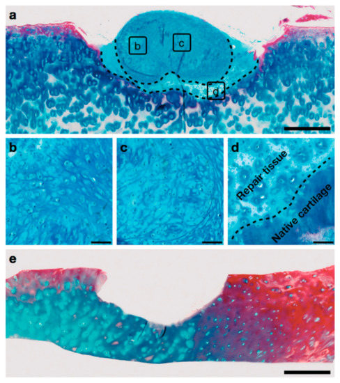 Implantation of an acoustically generated cartilage graft in healthy human tissue with a drilled defect (a). Close-ups are shown in (b,d), and in particular, (d) shows the fusion between the native tissue and the graft with formation of hyaline cartilage in the gap. A defect before implantation is shown in (e). The scale bars in (a,e) correspond to 500 µm; whereas the scale bars in (b,d) correspond to 50 µm. Reprinted from [63] published by the Royal Society of Chemistry.