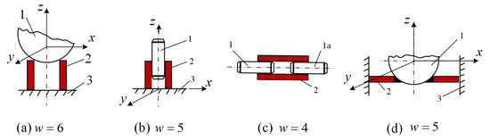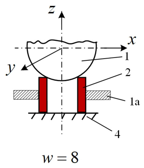 Several principle design schemes of the piezoelectric actuator with two kinematic pairs are shown in Figure 1, where w is the total number of the degrees-of-freedom of moving links 1 and 1a; 2 is the piezoelectric cylinder with special sectioning of electrodes, and 3 is a frame, on which additional displacements occur. Thus, the displacements of the moving link are quite evident: link 1 rotates around axes x, y, z and affects the translational motion in directions x, y and rotation around axis z (Figure 1a); link 1 rotates around axis z, affects translational motion in the direction of z axis and moves on the plane x, y (Figure 1b); links 1 and 1a rotate around axis x and move along it (Figure 1c); link 1 rotates around axes x, y, z and affects translational motion in the direction of z axis and rotation around the same axis (Figure 1d).
