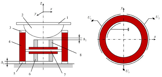 Figure 3. The laser deflector made on the basis of a single piezoelectric actuator with two active kinematic pairs and two brakes, activated with the help of a bimorph piezoelectric actuator, generating static bending displacements: 1—mirror, 2—spherical element, 3—three contacts made of high friction material, 4—piezoelectric cylinder with radial poling, 5—three contacts made of high friction material, 6 and 8— permanent magnets - brakes, fixed to bimorph actuator 7, working in static displacement mode; , when the displacement of bimorph actuator 7 is negative (the brake is applied to the lower kinematic pair— displacements on the plane); , when the displacement of bimorph actuator 7 is positive (the brake is applied to the upper kinematic pair—angular displacements on the sphere). - connecting the same frequency voltage to specific electrodes, but with a different phase (180°) and amplitude, as in the main driving source