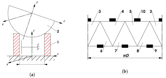 A mathematical model for sphere positioning in space through contacting force control was developed. One active kinematic pair of the actuator was used for sphere positioning on the plane. This kind of positioning is performed by moving the piezoelectric cylinder on the plane. Another active kinematic pair is used to rotate the sphere about three axes. All previously studied positioning systems had only one kinematic pair, i.e., the active cylinder was moved on the plane or the sphere was rotated about different axes. Combining two kinematic pairs and applying the brakes, as shown in Figure 3, we obtain one active cylinder with two kinematic pairs (Figure 4a). The configuration of electrodes should be as follows (Figure 4b):