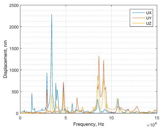 The amplitudes of the contact point in the middle of electrode 4 (Figure 4b) are shown at Figure 5. The modal analysis shows that the required eigenform is at 88,371 Hz (Figure 6); therefore, a resonant frequency at 88,600 Hz will be further analyzed. This frequency resonates with the correct eigenform. The calculations and analysis were performed using ANSYS software.