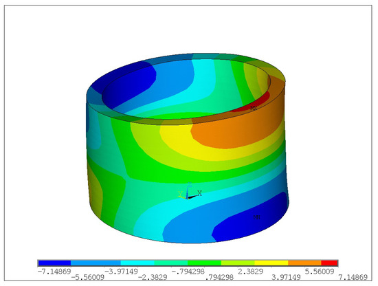 We will further analyze the piezoelectric cylinder-type actuator with two kinematic pairs as shown in Figure 4a. A triangular electrode configuration is used to excite vibrations of the actuator (Figure 4b). The brakes of active kinematic pairs are not included. The piezoelectric cylinder has the following dimensions: 28 mm (inner diameter) × 33 mm (outer diameter) × 20 mm (height) and is made from PZT-8 material. A steel sphere is positioned on top of the cylinder (Figure 4a). The outer surface of the cylinder is covered with triangular electrodes as shown in Figure 4b, while the inner surface of the cylinder has a single electrode and is grounded.